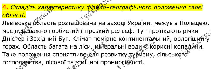 Складіть характеристику фізико–географічного положення своєї області. Львівська область розташована на заході України, межує з Польщею, має переважно горбистий і гірський рельєф. Тут протікають річки Дністер і Західний Буг. Клімат помірно континентальний, вологіший у горах. Область багата на ліси, мінеральні води й корисні копалини. Таке положення сприятливе для розвитку туризму, сільського господарства, лісової та хімічної промисловості.