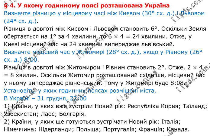 § 4. У якому годинному поясі розташована Україна Визначте різницю у місцевому часі між Києвом (30° сх. д.) і Львовом (24° сх. д.). Різниця в довготі між Києвом і Львовом становить 6°. Оскільки Земля обертається на 1° за 4 хвилини, то 6 × 4 = 24 хвилини. Отже, у Києві місцевий час на 24 хвилини випереджає львівський. Визначте місцевий час у Житомирі (28° сх. д.), якщо у Рівному (26° сх. д.) 8:00. Різниця в довготі між Житомиром і Рівним становить 2°. Отже, 2 × 4 = 8 хвилин. Оскільки Житомир розташований східніше, місцевий час у ньому випереджає рівненський. Тому у Житомирі буде 8:08. Установіть, у яких годинних поясах розміщені міста. В Україні – 31 грудня, 22:00 1) Країни, у яких вже зустріли Новий рік: Республіка Корея; Таїланд; Узбекистан; Лаос; Болгарія. 2) Країни, у яких ще готуються зустрічати Новий рік: Італія; Німеччина; Нідерланди; Польща; Португалія; Франція; Канада.