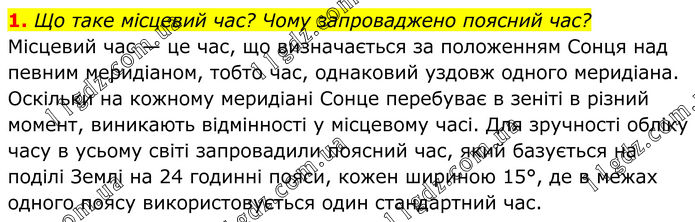 Що таке місцевий час? Чому запроваджено поясний час? Місцевий час — це час, що визначається за положенням Сонця над певним меридіаном, тобто час, однаковий уздовж одного меридіана. Оскільки на кожному меридіані Сонце перебуває в зеніті в різний момент, виникають відмінності у місцевому часі. Для зручності обліку часу в усьому світі запровадили поясний час, який базується на поділі Землі на 24 годинні пояси, кожен шириною 15°, де в межах одного поясу використовується один стандартний час.
