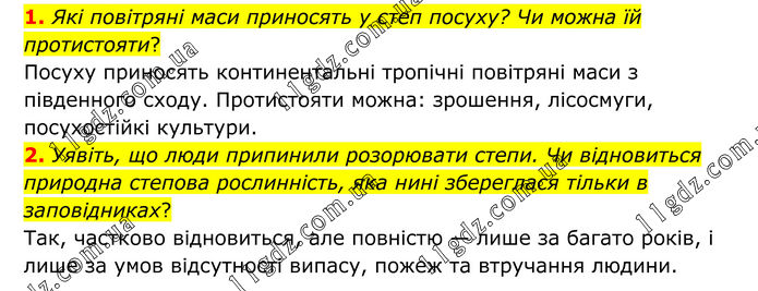 1. Які повітряні маси приносять у степ посуху? Чи можна їй протистояти? Посуху приносять континентальні тропічні повітряні маси з південного сходу. Протистояти можна: зрошення, лісосмуги, посухостійкі культури. 2. Уявіть, що люди припинили розорювати степи. Чи відновиться природна степова рослинність, яка нині збереглася тільки в заповідниках? Так, частково відновиться, але повністю — лише за багато років, і лише за умов відсутності випасу, пожеж та втручання людини.