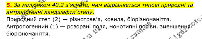 5. За малюнком 40.2 з’ясуйте, чим відрізняється типові природні та антропогенні ландшафти степу. Природний степ (2) — різнотрав’я, ковила, біорізноманіття. Антропогенний (1) — розорані поля, монотипні посіви, зменшення біорізноманіття.