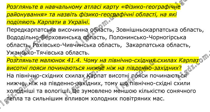 Розгляньте в навчальному атласі карту «Фізико-географічне районування» та назвіть фізико-географічні області, на які поділяють Карпати в Україні. Передкарпатська височинна область, Зовнішньокарпатська область, Вододільно-Верховинська область, Полонинсько-Чорногірська область, Рахівсько-Чивчинська область, Закарпатська область, Ужансько-Тячівська область. Розгляньте малюнок 41.4. Чому на північно-східних схилах Карпат висотні пояси починаються нижче ніж на південно-західних? На північно-східних схилах Карпат висотні пояси починаються нижче, ніж на південно-західних, тому що північно-східні схили холодніші та вологіші. Це зумовлено меншою кількістю сонячного тепла та сильнішим впливом холодних повітряних мас.