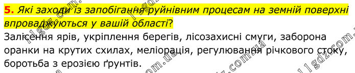 5. Які заходи із запобігання руйнівним процесам на земній поверхні впроваджуються у вашій області? Залісення ярів, укріплення берегів, лісозахисні смуги, заборона оранки на крутих схилах, меліорація, регулювання річкового стоку, боротьба з ерозією ґрунтів.