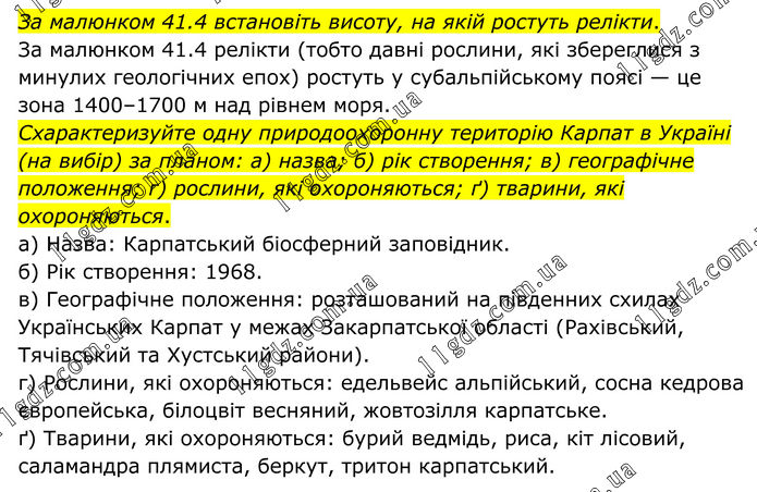 За малюнком 41.4 встановіть висоту, на якій ростуть релікти. За малюнком 41.4 релікти (тобто давні рослини, які збереглися з минулих геологічних епох) ростуть у субальпійському поясі — це зона 1400–1700 м над рівнем моря. Схарактеризуйте одну природоохоронну територію Карпат в Україні (на вибір) за планом: а) назва; б) рік створення; в) географічне положення; г) рослини, які охороняються; ґ) тварини, які охороняються. а) Назва: Карпатський біосферний заповідник. б) Рік створення: 1968. в) Географічне положення: розташований на південних схилах Українських Карпат у межах Закарпатської області (Рахівський, Тячівський та Хустський райони). г) Рослини, які охороняються: едельвейс альпійський, сосна кедрова європейська, білоцвіт весняний, жовтозілля карпатське. ґ) Тварини, які охороняються: бурий ведмідь, риса, кіт лісовий, саламандра плямиста, беркут, тритон карпатський.