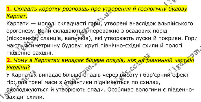 1. Складіть коротку розповідь про утворення й геологічну будову Карпат. Карпати — молоді складчасті гори, утворені внаслідок альпійського орогенезу. Вони складаються переважно з осадових порід (пісковиків, сланців, вапняків), які утворюють луски й покриви. Гори мають асиметричну будову: круті північно-східні схили й пологі південно-західні. 2. Чому в Карпатах випадає більше опадів, ніж на рівнинній частині України? У Карпатах випадає більше опадів через висоту і бар'єрний ефект гір: повітряні маси з Атлантики піднімаються по схилах, охолоджуються й утворюють опади. Особливо вологими є південно-західні схили.