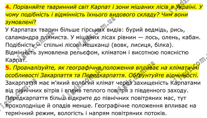 4. Порівняйте тваринний світ Карпат і зони мішаних лісів в Україні. У чому подібність і відмінність їхнього видового складу? Чим вони зумовлені? У Карпатах тварин більше гірських видів: бурий ведмідь, рись, саламандра плямиста. У мішаних лісах рівнин — лось, олень, кабан. Подібність — спільні лісові мешканці (вовк, лисиця, білка). Відмінність зумовлена рельєфом, кліматом і висотною поясністю Карпат. 5. Проаналізуйте, як географічне положення впливає на кліматичні особливості Закарпаття та Передкарпаття. Обґрунтуйте відмінності. Закарпаття має м’який вологий клімат через захищеність Карпатами від північних вітрів і вплив теплого повітря з південного заходу. Передкарпаття більш відкрите до північних повітряних мас, тут прохолодніше й опадів менше. Географічне положення впливає на термічний режим, вологість і напрям повітряних потоків.