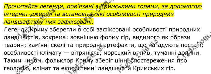 Прочитайте легенди, пов’язані з Кримськими горами, за допомогою інтернет-джерел та встановіть, які особливості природних ландшафтів у них зафіксовані. Легенди Криму зберегли в собі зафіксовані особливості природних ландшафтів, зокрема: зовнішню форму гір, видимого як образи тварин; кам’яні скелі та природні артефакти, що нагадують постаті; особливості клімату — вітряність, морський вплив, туманні долини. Таким чином, фольклор Криму зберіг цінні спостереження про геологію, клімат та екосистемні ландшафти Кримських гір.