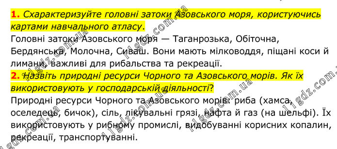 1. Схарактеризуйте головні затоки Азовського моря, користуючись картами навчального атласу. Головні затоки Азовського моря — Таганрозька, Обіточна, Бердянська, Молочна, Сиваш. Вони мають мілководдя, піщані коси й лимани, важливі для рибальства та рекреації. 2. Назвіть природні ресурси Чорного та Азовського морів. Як їх використовують у господарській діяльності? Природні ресурси Чорного та Азовського морів: риба (хамса, оселедець, бичок), сіль, лікувальні грязі, нафта й газ (на шельфі). Їх використовують у рибному промислі, видобуванні корисних копалин, рекреації, транспортуванні.