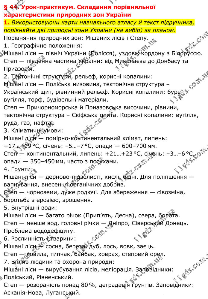 § 44. Урок-практикум. Складання порівняльної характеристики природних зон України 1. Використовуючи карти навчального атласу й текст підручника, порівняйте дві природні зони України (на вибір) за планом. Порівняння природних зон: Мішаних лісів і Степу. 1. Географічне положення: Мішані ліси — північ України (Полісся), уздовж кордону з Білоруссю. Степ — південна частина України: від Миколаєва до Донбасу та Приазов’я. 2. Тектонічні структури, рельєф, корисні копалини: Мішані ліси — Поліська низовина, тектонічна структура – Український щит, рівнинний рельєф. Корисні копалини: буре вугілля, торф, будівельні матеріали. Степ — Причорноморська й Приазовська височини, рівнини, тектонічна структура – Скіфська плита. Корисні копалини: вугілля, руда, газ, нафта. 3. Кліматичні умови: Мішані ліси — помірно-континентальний клімат, липень: +17…+19 °C, січень: –5…–7 °C, опади — 600–700 мм. Степ — континентальний, липень: +21…+23 °C, січень: –3…–6 °C, опади — 350–450 мм, часто з посухами. 4. Ґрунти: Мішані ліси — дерново-підзолисті, кислі, бідні. Для поліпшення — вапнування, внесення органічних добрив. Степ — чорноземи, дуже родючі. Для збереження — сівозміна, боротьба з ерозією, зрошення. 5. Внутрішні води: Мішані ліси — багато річок (Прип’ять, Десна), озера, болота. Степ — менше вод, головні річки — Дніпро, Сіверський Донець. Проблема вододефіциту. 6. Рослинність і тварини: Мішані ліси — сосна, береза, дуб, лось, вовк, заєць. Степ — ковила, типчак, байбак, ховрах, степовий орел. 7. Вплив людини та охорона природи: Мішані ліси — вирубування лісів, меліорація. Заповідники: Поліський, Рівненський. Степ — розораність понад 80 %, деградація ґрунтів. Заповідники: Асканія-Нова, Луганський.
