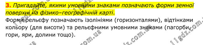 3. Пригадайте, якими умовними знаками позначають форми земної поверхні на фізико–географічній карті. Форми рельєфу позначають ізолініями (горизонталями), відтінками кольору (для висоти) та рельєфними умовними знаками (пагорби, гори, яри, долини тощо).