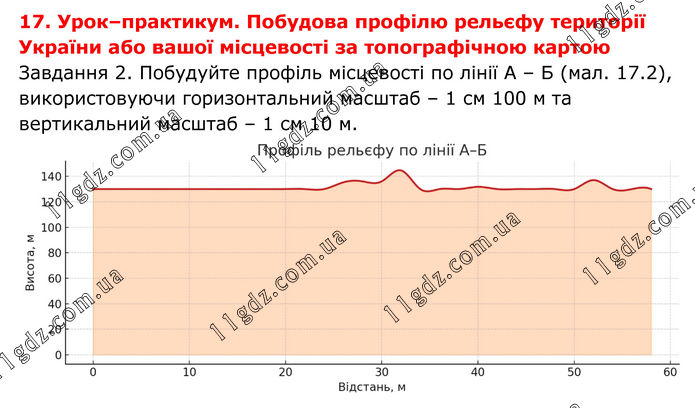 17. Урок–практикум. Побудова профілю рельєфу території України або вашої місцевості за топографічною картою Завдання 2. Побудуйте профіль місцевості по лінії А – Б (мал. 17.2), використовуючи горизонтальний масштаб – 1 см 100 м та вертикальний масштаб – 1 см 10 м.