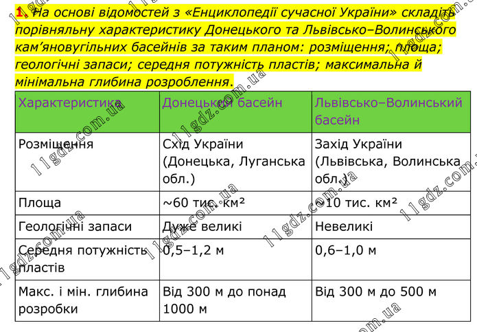 1. На основі відомостей з «Енциклопедії сучасної України» складіть порівняльну характеристику Донецького та Львівсько–Волинського кам’яновугільних басейнів за таким планом: розміщення; площа; геологічні запаси; середня потужність пластів; максимальна й мінімальна глибина розроблення.