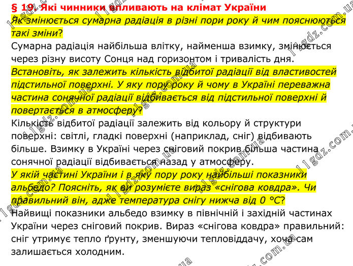 § 19. Які чинники впливають на клімат України Як змінюється сумарна радіація в різні пори року й чим пояснюються такі зміни? Сумарна радіація найбільша влітку, найменша взимку, змінюється через різну висоту Сонця над горизонтом і тривалість дня. Встановіть, як залежить кількість відбитої радіації від властивостей підстильної поверхні. У яку пору року й чому в Україні переважна частина сонячної радіації відбивається від підстильної поверхні й повертається в атмосферу? Кількість відбитої радіації залежить від кольору й структури поверхні: світлі, гладкі поверхні (наприклад, сніг) відбивають більше. Взимку в Україні через сніговий покрив більша частина сонячної радіації відбивається назад у атмосферу. У якій частині України і в яку пору року найбільші показники альбедо? Поясніть, як ви розумієте вираз «снігова ковдра». Чи правильний він, адже температура снігу нижча від 0 °С? Найвищі показники альбедо взимку в північній і західній частинах України через сніговий покрив. Вираз «снігова ковдра» правильний: сніг утримує тепло ґрунту, зменшуючи тепловіддачу, хоча сам залишається холодним.