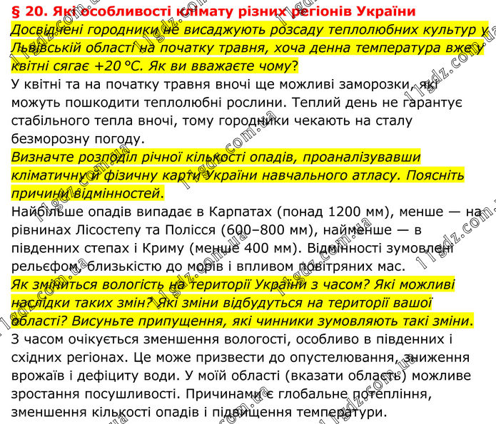 § 20. Які особливості клімату різних регіонів України Досвідчені городники не висаджують розсаду теплолюбних культур у Львівській області на початку травня, хоча денна температура вже у квітні сягає +20 °C. Як ви вважаєте чому? У квітні та на початку травня вночі ще можливі заморозки, які можуть пошкодити теплолюбні рослини. Теплий день не гарантує стабільного тепла вночі, тому городники чекають на сталу безморозну погоду. Визначте розподіл річної кількості опадів, проаналізувавши кліматичну й фізичну карти України навчального атласу. Поясніть причини відмінностей. Найбільше опадів випадає в Карпатах (понад 1200 мм), менше — на рівнинах Лісостепу та Полісся (600–800 мм), найменше — в південних степах і Криму (менше 400 мм). Відмінності зумовлені рельєфом, близькістю до морів і впливом повітряних мас. Як зміниться вологість на території України з часом? Які можливі наслідки таких змін? Які зміни відбудуться на території вашої області? Висуньте припущення, які чинники зумовляють такі зміни. З часом очікується зменшення вологості, особливо в південних і східних регіонах. Це може призвести до опустелювання, зниження врожаїв і дефіциту води. У моїй області (вказати область) можливе зростання посушливості. Причинами є глобальне потепління, зменшення кількості опадів і підвищення температури.