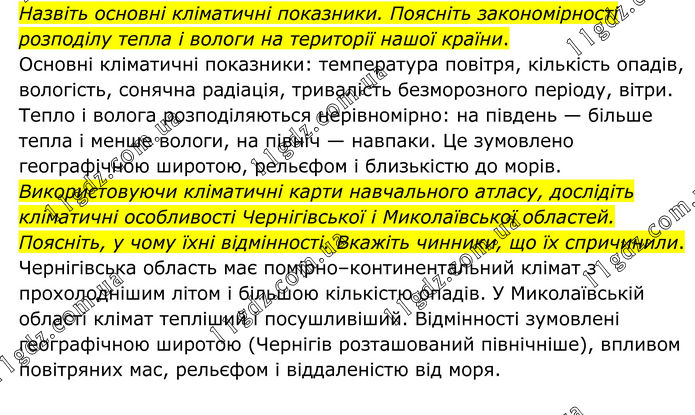 Назвіть основні кліматичні показники. Поясніть закономірності розподілу тепла і вологи на території нашої країни. Основні кліматичні показники: температура повітря, кількість опадів, вологість, сонячна радіація, тривалість безморозного періоду, вітри. Тепло і волога розподіляються нерівномірно: на південь — більше тепла і менше вологи, на північ — навпаки. Це зумовлено географічною широтою, рельєфом і близькістю до морів. Використовуючи кліматичні карти навчального атласу, дослідіть кліматичні особливості Чернігівської і Миколаївської областей. Поясніть, у чому їхні відмінності. Вкажіть чинники, що їх спричинили. Чернігівська область має помірно–континентальний клімат з прохолоднішим літом і більшою кількістю опадів. У Миколаївській області клімат тепліший і посушливіший. Відмінності зумовлені географічною широтою (Чернігів розташований північніше), впливом повітряних мас, рельєфом і віддаленістю від моря.