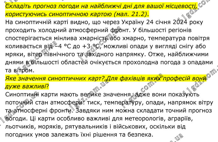 Складіть прогноз погоди на найближчі дні для вашої місцевості, користуючись синоптичною картою (мал. 21.2). На синоптичній карті видно, що через Україну 24 січня 2024 року проходить холодний атмосферний фронт. У більшості регіонів спостерігається мінлива хмарність або хмарно, температура повітря коливається від –4 °C до +3 °C, можливі опади у вигляді снігу або мряки, вітер північного та західного напрямку. Отже, найближчими днями в більшості областей очікується прохолодна погода з опадами та вітром. Яке значення синоптичних карт? Для фахівців яких професій вони дуже важливі? Синоптичні карти мають велике значення, адже вони показують поточний стан атмосфери: тиск, температуру, опади, напрямок вітру та атмосферні фронти. Завдяки ним можна складати точний прогноз погоди. Ці карти особливо важливі для метеорологів, аграріїв, льотчиків, моряків, рятувальників і військових, оскільки від погодних умов залежать їхні рішення та безпека.