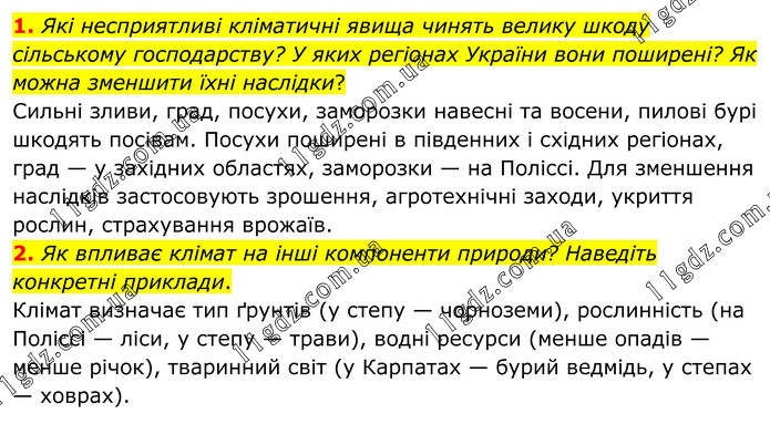 1. Які несприятливі кліматичні явища чинять велику шкоду сільському господарству? У яких регіонах України вони поширені? Як можна зменшити їхні наслідки? Сильні зливи, град, посухи, заморозки навесні та восени, пилові бурі шкодять посівам. Посухи поширені в південних і східних регіонах, град — у західних областях, заморозки — на Поліссі. Для зменшення наслідків застосовують зрошення, агротехнічні заходи, укриття рослин, страхування врожаїв. 2. Як впливає клімат на інші компоненти природи? Наведіть конкретні приклади. Клімат визначає тип ґрунтів (у степу — чорноземи), рослинність (на Поліссі — ліси, у степу — трави), водні ресурси (менше опадів — менше річок), тваринний світ (у Карпатах — бурий ведмідь, у степах — ховрах).