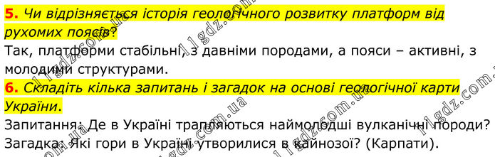 5. Чи відрізняється історія геологічного розвитку платформ від рухомих поясів? Так, платформи стабільні, з давніми породами, а пояси – активні, з молодими структурами. 6. Складіть кілька запитань і загадок на основі геологічної карти України. Запитання: Де в Україні трапляються наймолодші вулканічні породи? Загадка: Які гори в Україні утворилися в кайнозої? (Карпати).