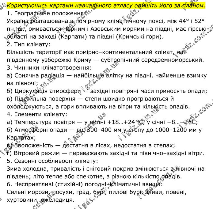 Користуючись картами навчального атласу опишіть його за планом. 1. Географічне положення: Україна розташована в помірному кліматичному поясі, між 44° і 52° пн. ш., омивається Чорним і Азовським морями на півдні, має гірські області на заході (Карпати) та півдні (Кримські гори). 2. Тип клімату: Більшість території має помірно–континентальний клімат, на південному узбережжі Криму — субтропічний середземноморський. 3. Чинники кліматотворення: а) Сонячна радіація — найбільше влітку на півдні, найменше взимку на півночі; б) Циркуляція атмосфери — західні повітряні маси приносять опади; в) Підстильна поверхня — степи швидко прогріваються й охолоджуються, а гори впливають на вітри та кількість опадів. 4. Елементи клімату: а) Температура повітря — у липні +18…+24 °C, у січні −8…−2 °C; б) Атмосферні опади — від 300–400 мм у степу до 1000–1200 мм у Карпатах; в) Зволоженість — достатня в лісах, недостатня в степах; г) Вітровий режим — переважають західні та північно–західні вітри. 5. Сезонні особливості клімату: Зима холодна, тривалість і сніговий покрив змінюються з півночі на південь; літо тепле або спекотне, з різною кількістю опадів. 6. Несприятливі (стихійні) погодні–кліматичні явища: Сильні морози, посухи, град, бурі, пилові бурі, зливи, повені, хуртовини, ожеледиця.