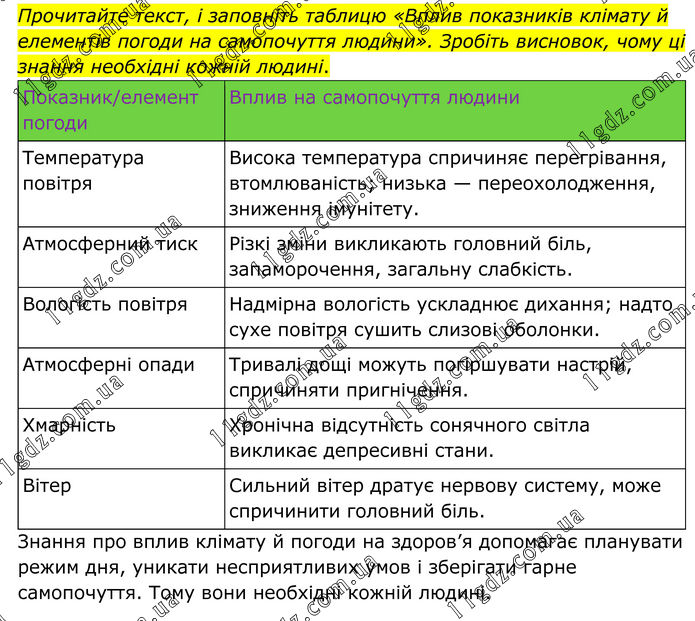 Прочитайте текст, і заповніть таблицю «Вплив показників клімату й елементів погоди на самопочуття людини». Зробіть висновок, чому ці знання необхідні кожній людині. Знання про вплив клімату й погоди на здоров’я допомагає планувати режим дня, уникати несприятливих умов і зберігати гарне самопочуття. Тому вони необхідні кожній людині.