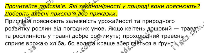 Прочитайте прислів’я. Які закономірності у природі вони пояснюють? Доберіть власні прислів’я або приказки. Прислів’я пояснюють залежність урожайності та природного розвитку рослин від погодних умов. Якщо квітень дощовий — трава та рослинність у травні добре ростимуть; прохолодний травень сприяє врожаю хліба, бо волога краще зберігається в ґрунті.
