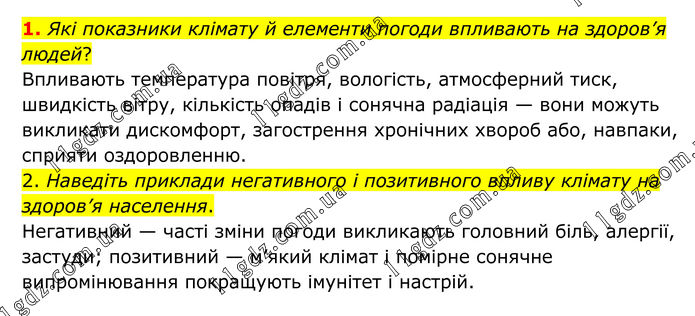 1. Які показники клімату й елементи погоди впливають на здоров’я людей? Впливають температура повітря, вологість, атмосферний тиск, швидкість вітру, кількість опадів і сонячна радіація — вони можуть викликати дискомфорт, загострення хронічних хвороб або, навпаки, сприяти оздоровленню. 2. Наведіть приклади негативного і позитивного впливу клімату на здоров’я населення. Негативний — часті зміни погоди викликають головний біль, алергії, застуди; позитивний — м’який клімат і помірне сонячне випромінювання покращують імунітет і настрій.