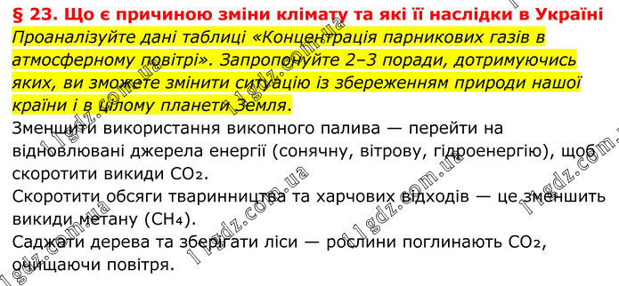 § 23. Що є причиною зміни клімату та які її наслідки в Україні Проаналізуйте дані таблиці «Концентрація парникових газів в атмосферному повітрі». Запропонуйте 2–3 поради, дотримуючись яких, ви зможете змінити ситуацію із збереженням природи нашої країни і в цілому планети Земля. Зменшити використання викопного палива — перейти на відновлювані джерела енергії (сонячну, вітрову, гідроенергію), щоб скоротити викиди CO₂. Скоротити обсяги тваринництва та харчових відходів — це зменшить викиди метану (CH₄). Саджати дерева та зберігати ліси — рослини поглинають CO₂, очищаючи повітря.