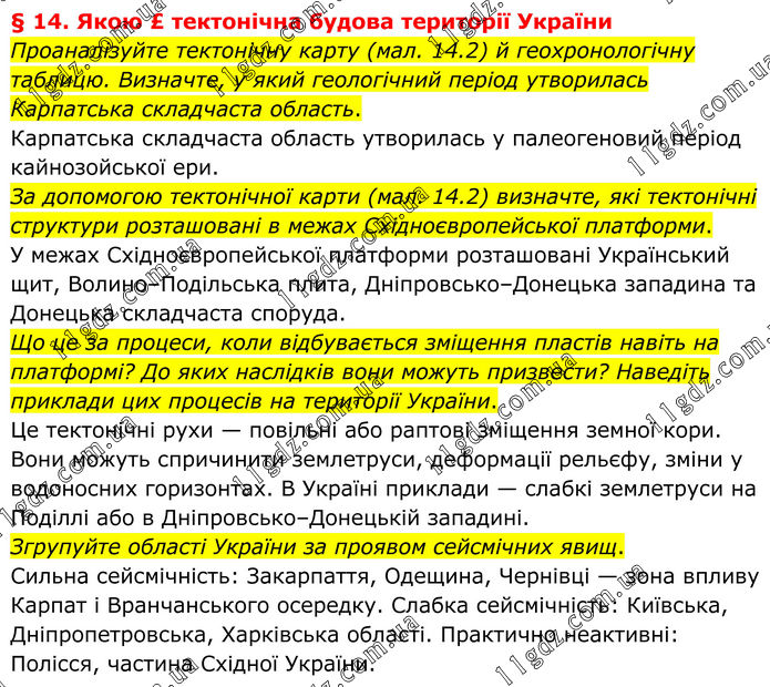§ 14. Якою є тектонічна будова території України Проаналізуйте тектонічну карту (мал. 14.2) й геохронологічну таблицю. Визначте, у який геологічний період утворилась Карпатська складчаста область. Карпатська складчаста область утворилась у палеогеновий період кайнозойської ери. За допомогою тектонічної карти (мал. 14.2) визначте, які тектонічні структури розташовані в межах Східноєвропейської платформи. У межах Східноєвропейської платформи розташовані Український щит, Волино–Подільська плита, Дніпровсько–Донецька западина та Донецька складчаста споруда. Що це за процеси, коли відбувається зміщення пластів навіть на платформі? До яких наслідків вони можуть призвести? Наведіть приклади цих процесів на території України. Це тектонічні рухи — повільні або раптові зміщення земної кори. Вони можуть спричинити землетруси, деформації рельєфу, зміни у водоносних горизонтах. В Україні приклади — слабкі землетруси на Поділлі або в Дніпровсько–Донецькій западині. Згрупуйте області України за проявом сейсмічних явищ. Сильна сейсмічність: Закарпаття, Одещина, Чернівці — зона впливу Карпат і Вранчанського осередку. Слабка сейсмічність: Київська, Дніпропетровська, Харківська області. Практично неактивні: Полісся, частина Східної України.
