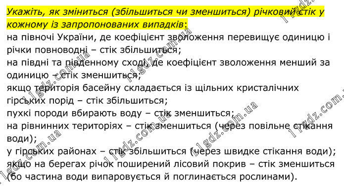 Укажіть, як зміниться (збільшиться чи зменшиться) річковий стік у кожному із запропонованих випадків: на півночі України, де коефіцієнт зволоження перевищує одиницю і річки повноводні – стік збільшиться; на півдні та південному сході, де коефіцієнт зволоження менший за одиницю – стік зменшиться; якщо територія басейну складається із щільних кристалічних гірських порід – стік збільшиться; пухкі породи вбирають воду – стік зменшиться; на рівнинних територіях – стік зменшиться (через повільне стікання води); у гірських районах – стік збільшиться (через швидке стікання води); якщо на берегах річок поширений лісовий покрив – стік зменшиться (бо частина води випаровується й поглинається рослинами).