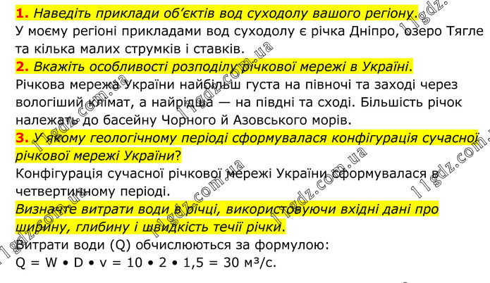 1. Наведіть приклади об’єктів вод суходолу вашого регіону. У моєму регіоні прикладами вод суходолу є річка Дніпро, озеро Тягле та кілька малих струмків і ставків. 2. Вкажіть особливості розподілу річкової мережі в Україні. Річкова мережа України найбільш густа на півночі та заході через вологіший клімат, а найрідша — на півдні та сході. Більшість річок належать до басейну Чорного й Азовського морів. 3. У якому геологічному періоді сформувалася конфігурація сучасної річкової мережі України? Конфігурація сучасної річкової мережі України сформувалася в четвертинному періоді. Визначте витрати води в річці, використовуючи вхідні дані про ширину, глибину і швидкість течії річки. Витрати води (Q) обчислюються за формулою: Q = W • D • v = 10 • 2 • 1,5 = 30 м³/с.