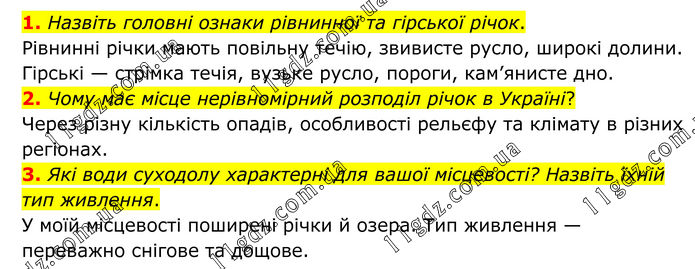 1. Назвіть головні ознаки рівнинної та гірської річок. Рівнинні річки мають повільну течію, звивисте русло, широкі долини. Гірські — стрімка течія, вузьке русло, пороги, кам’янисте дно. 2. Чому має місце нерівномірний розподіл річок в Україні? Через різну кількість опадів, особливості рельєфу та клімату в різних регіонах. 3. Які води суходолу характерні для вашої місцевості? Назвіть їхній тип живлення. У моїй місцевості поширені річки й озера. Тип живлення — переважно снігове та дощове.