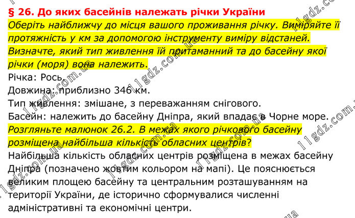 § 26. До яких басейнів належать річки України Оберіть найближчу до місця вашого проживання річку. Виміряйте її протяжність у км за допомогою інструменту виміру відстаней. Визначте, який тип живлення їй притаманний та до басейну якої річки (моря) вона належить. Річка: Рось. Довжина: приблизно 346 км. Тип живлення: змішане, з переважанням снігового. Басейн: належить до басейну Дніпра, який впадає в Чорне море. Розгляньте малюнок 26.2. В межах якого річкового басейну розміщена найбільша кількість обласних центрів? Найбільша кількість обласних центрів розміщена в межах басейну Дніпра (позначено жовтим кольором на мапі). Це пояснюється великим площею басейну та центральним розташуванням на території України, де історично сформувалися численні адміністративні та економічні центри.