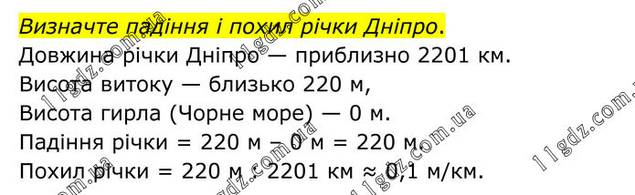 Визначте падіння і похил річки Дніпро. Довжина річки Дніпро — приблизно 2201 км. Висота витоку — близько 220 м, Висота гирла (Чорне море) — 0 м. Падіння річки = 220 м – 0 м = 220 м. Похил річки = 220 м : 2201 км ≈ 0,1 м/км.