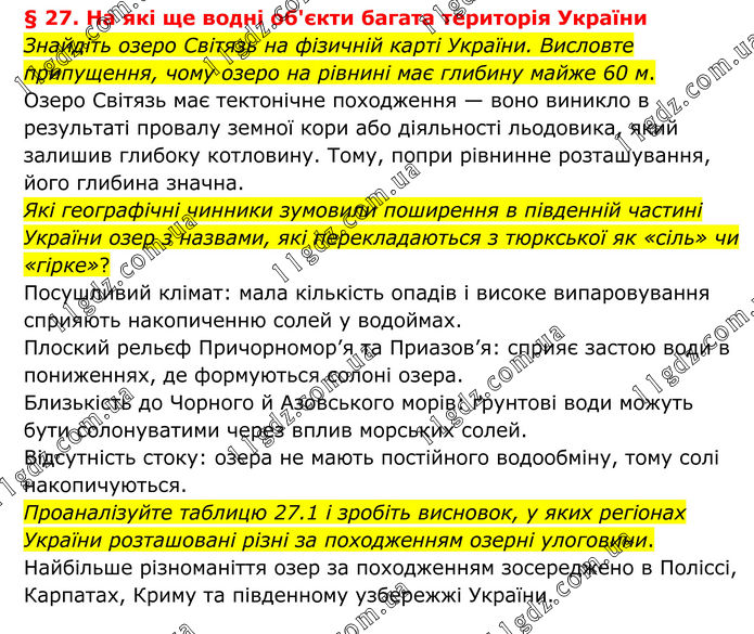 § 27. На які ще водні об'єкти багата територія України Знайдіть озеро Світязь на фізичній карті України. Висловте припущення, чому озеро на рівнині має глибину майже 60 м. Озеро Світязь має тектонічне походження — воно виникло в результаті провалу земної кори або діяльності льодовика, який залишив глибоку котловину. Тому, попри рівнинне розташування, його глибина значна. Які географічні чинники зумовили поширення в південній частині України озер з назвами, які перекладаються з тюркської як «сіль» чи «гірке»? Посушливий клімат: мала кількість опадів і високе випаровування сприяють накопиченню солей у водоймах. Плоский рельєф Причорномор’я та Приазов’я: сприяє застою води в пониженнях, де формуються солоні озера. Близькість до Чорного й Азовського морів: ґрунтові води можуть бути солонуватими через вплив морських солей. Відсутність стоку: озера не мають постійного водообміну, тому солі накопичуються. Проаналізуйте таблицю 27.1 і зробіть висновок, у яких регіонах України розташовані різні за походженням озерні улоговини. Найбільше різноманіття озер за походженням зосереджено в Поліссі, Карпатах, Криму та південному узбережжі України.