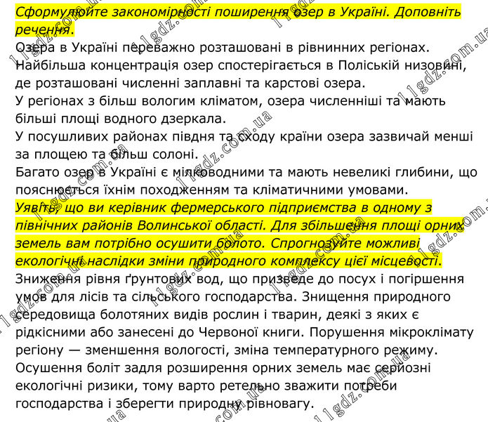 Сформулюйте закономірності поширення озер в Україні. Доповніть речення. Озера в Україні переважно розташовані в рівнинних регіонах. Найбільша концентрація озер спостерігається в Поліській низовині, де розташовані численні заплавні та карстові озера. У регіонах з більш вологим кліматом, озера численніші та мають більші площі водного дзеркала. У посушливих районах півдня та сходу країни озера зазвичай менші за площею та більш солоні. Багато озер в Україні є мілководними та мають невеликі глибини, що пояснюється їхнім походженням та кліматичними умовами. Уявіть, що ви керівник фермерського підприємства в одному з північних районів Волинської області. Для збільшення площі орних земель вам потрібно осушити болото. Спрогнозуйте можливі екологічні наслідки зміни природного комплексу цієї місцевості. Зниження рівня ґрунтових вод, що призведе до посух і погіршення умов для лісів та сільського господарства. Знищення природного середовища болотяних видів рослин і тварин, деякі з яких є рідкісними або занесені до Червоної книги. Порушення мікроклімату регіону — зменшення вологості, зміна температурного режиму. Осушення боліт задля розширення орних земель має серйозні екологічні ризики, тому варто ретельно зважити потреби господарства і зберегти природну рівновагу.