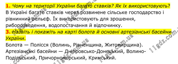 1. Чому на території України багато ставків? Як їх використовують? В Україні багато ставків через розвинене сільське господарство і рівнинний рельєф. Їх використовують для зрошення, риборозведення, водопостачання й відпочинку. 3. Назвіть і покажіть на карті болота й основні артезіанські басейни України. Болота — Полісся (Волинь, Рівненщина, Житомирщина). Артезіанські басейни — Дніпровсько-Донецький, Волино-Подільський, Причорноморський, Кримський.