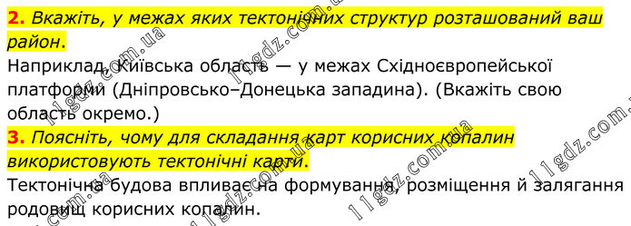2. Вкажіть, у межах яких тектонічних структур розташований ваш район. Наприклад, Київська область — у межах Східноєвропейської платформи (Дніпровсько–Донецька западина). (Вкажіть свою область окремо.) 3. Поясніть, чому для складання карт корисних копалин використовують тектонічні карти. Тектонічна будова впливає на формування, розміщення й залягання родовищ корисних копалин.