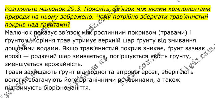 Розгляньте малюнок 29.3. Поясніть, зв’язок між якими компонентами природи на ньому зображено. Чому потрібно зберігати трав’янистий покрив над ґрунтами? Малюнок показує зв’язок між рослинним покривом (травами) і ґрунтом. Коріння трав утримує верхній шар ґрунту від змивання дощовими водами. Якщо трав’янистий покрив зникає, ґрунт зазнає ерозії — родючий шар змивається, погіршується якість ґрунту, зменшується врожайність. Трави захищають ґрунт від водної та вітрової ерозії, зберігають вологу, збагачують його органічними речовинами, а також підтримують біорізноманіття.