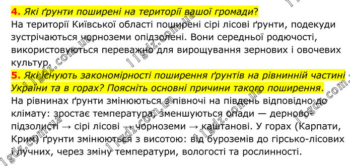 4. Які ґрунти поширені на території вашої громади? На території Київської області поширені сірі лісові ґрунти, подекуди зустрічаються чорноземи опідзолені. Вони середньої родючості, використовуються переважно для вирощування зернових і овочевих культур. 5. Які існують закономірності поширення ґрунтів на рівнинній частині України та в горах? Поясніть основні причини такого поширення. На рівнинах ґрунти змінюються з півночі на південь відповідно до клімату: зростає температура, зменшуються опади — дерново-підзолисті → сірі лісові → чорноземи → каштанові. У горах (Карпати, Крим) ґрунти змінюються з висотою: від буроземів до гірсько-лісових і лучних, через зміну температури, вологості та рослинності.