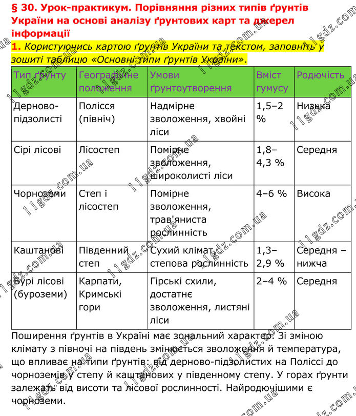 § 30. Урок-практикум. Порівняння різних типів ґрунтів України на основі аналізу ґрунтових карт та джерел інформації 1. Користуючись картою ґрунтів України та текстом, заповніть у зошиті таблицю «Основні типи ґрунтів України». Поширення ґрунтів в Україні має зональний характер. Зі зміною клімату з півночі на південь змінюється зволоження й температура, що впливає на типи ґрунтів: від дерново-підзолистих на Поліссі до чорноземів у степу й каштанових у південному степу. У горах ґрунти залежать від висоти та лісової рослинності. Найродючішими є чорноземи.