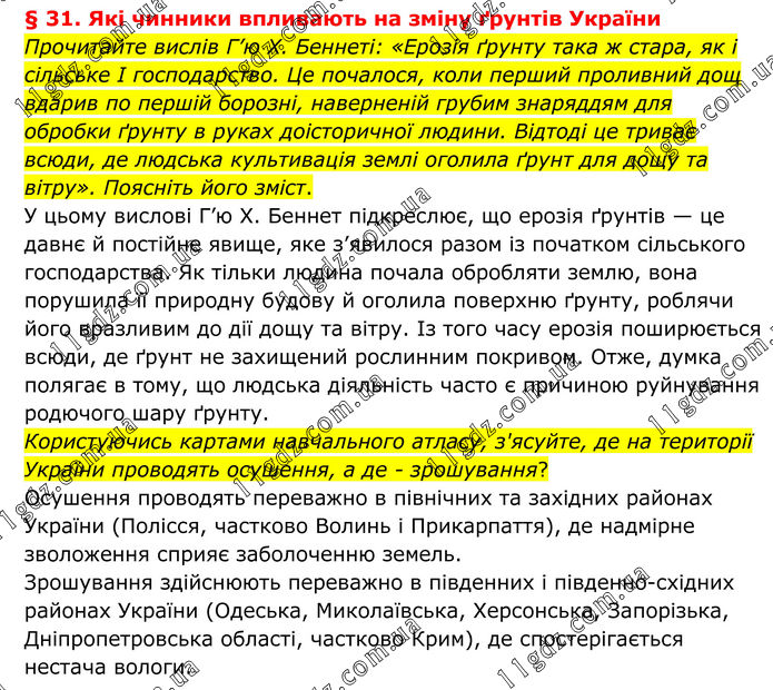 § 31. Які чинники впливають на зміну ґрунтів України Прочитайте вислів Г’ю Х. Беннеті: «Ерозія ґрунту така ж стара, як і сільське І господарство. Це почалося, коли перший проливний дощ вдарив по першій борозні, наверненій грубим знаряддям для обробки ґрунту в руках доісторичної людини. Відтоді це триває всюди, де людська культивація землі оголила ґрунт для дощу та вітру». Поясніть його зміст. У цьому вислові Г’ю Х. Беннет підкреслює, що ерозія ґрунтів — це давнє й постійне явище, яке з’явилося разом із початком сільського господарства. Як тільки людина почала обробляти землю, вона порушила її природну будову й оголила поверхню ґрунту, роблячи його вразливим до дії дощу та вітру. Із того часу ерозія поширюється всюди, де ґрунт не захищений рослинним покривом. Отже, думка полягає в тому, що людська діяльність часто є причиною руйнування родючого шару ґрунту. Користуючись картами навчального атласу, з'ясуйте, де на території України проводять осушення, а де - зрошування? Осушення проводять переважно в північних та західних районах України (Полісся, частково Волинь і Прикарпаття), де надмірне зволоження сприяє заболоченню земель. Зрошування здійснюють переважно в південних і південно-східних районах України (Одеська, Миколаївська, Херсонська, Запорізька, Дніпропетровська області, частково Крим), де спостерігається нестача вологи.