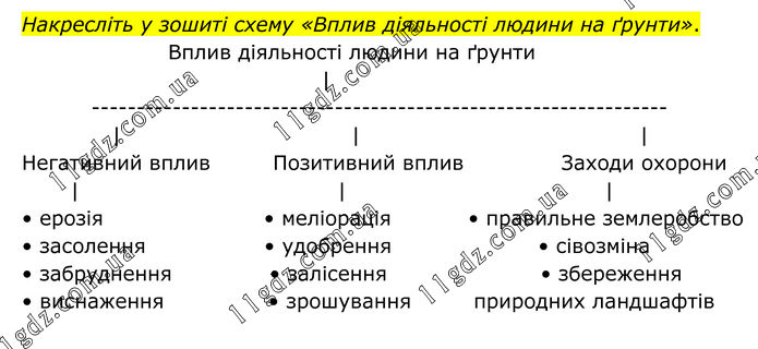 Накресліть у зошиті схему «Вплив діяльності людини на ґрунти». Вплив діяльності людини на ґрунти