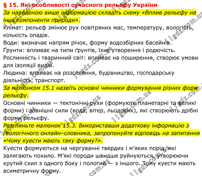 § 15. Які особливості сучасного рельєфу України За наведеною вище інформацією складіть схему «Вплив рельєфу на інші компоненти природи». Клімат: рельєф змінює рух повітряних мас, температуру, вологість, кількість опадів. Води: визначає напрям річок, форму водозбірних басейнів. Ґрунти: впливає на типи ґрунтів, їхнє утворення і родючість. Рослинність і тваринний світ: впливає на поширення, створює умови для ізоляції видів. Людина: впливає на розселення, будівництво, господарську діяльність, транспорт. За малюнком 15.1 назвіть основні чинники формування різних форм рельєфу. Основні чинники — тектонічні рухи (формують планетарні та великі форми) і зовнішні сили (вода, вітер, льодовик), які створюють дрібні форми рельєфу. Розгляньте малюнок 15.3. Використавши додаткову інформацію з геологічного онлайн–словника, запропонуйте відповідь на запитання «Чому куести мають таку форму?». Куести формуються на чергуванні твердих і м’яких порід, які залягають похило. М’які породи швидше руйнуються, утворюючи крутий схил з одного боку і пологий — з іншого. Тому куести мають асиметричну форму.