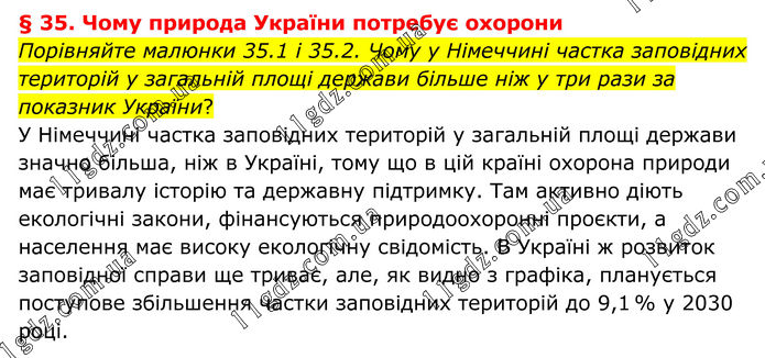 § 35. Чому природа України потребує охорони Порівняйте малюнки 35.1 і 35.2. Чому у Німеччині частка заповідних територій у загальній площі держави більше ніж у три рази за показник України? У Німеччині частка заповідних територій у загальній площі держави значно більша, ніж в Україні, тому що в цій країні охорона природи має тривалу історію та державну підтримку. Там активно діють екологічні закони, фінансуються природоохоронні проєкти, а населення має високу екологічну свідомість. В Україні ж розвиток заповідної справи ще триває, але, як видно з графіка, планується поступове збільшення частки заповідних територій до 9,1 % у 2030 році.