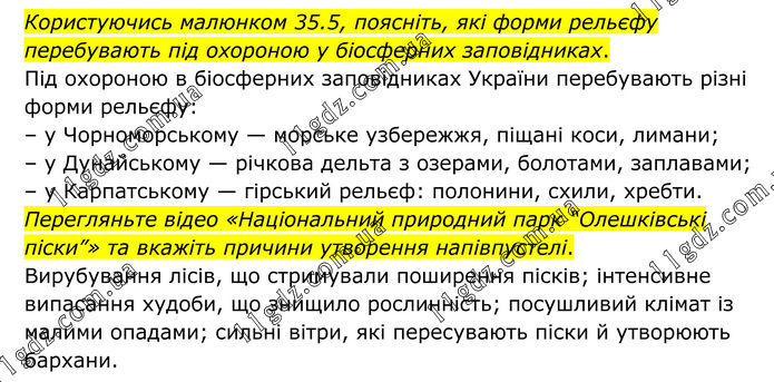 Користуючись малюнком 35.5, поясніть, які форми рельєфу перебувають під охороною у біосферних заповідниках. Під охороною в біосферних заповідниках України перебувають різні форми рельєфу: – у Чорноморському — морське узбережжя, піщані коси, лимани; – у Дунайському — річкова дельта з озерами, болотами, заплавами; – у Карпатському — гірський рельєф: полонини, схили, хребти. Перегляньте відео «Національний природний парк “Олешківські піски”» та вкажіть причини утворення напівпустелі. Вирубування лісів, що стримували поширення пісків; інтенсивне випасання худоби, що знищило рослинність; посушливий клімат із малими опадами; сильні вітри, які пересувають піски й утворюють бархани.