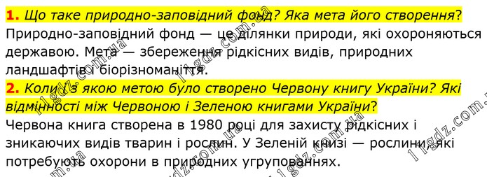 1. Що таке природно-заповідний фонд? Яка мета його створення? Природно-заповідний фонд — це ділянки природи, які охороняються державою. Мета — збереження рідкісних видів, природних ландшафтів і біорізноманіття. 2. Коли і з якою метою було створено Червону книгу України? Які відмінності між Червоною і Зеленою книгами України? Червона книга створена в 1980 році для захисту рідкісних і зникаючих видів тварин і рослин. У Зеленій книзі — рослини, які потребують охорони в природних угрупованнях.