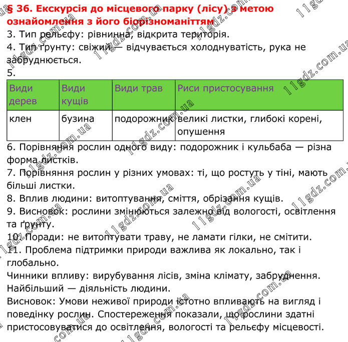 § 36. Екскурсія до місцевого парку (лісу) з метою ознайомлення з його біорізноманіттям 3. Тип рельєфу: рівнинна, відкрита територія. 4. Тип ґрунту: свіжий — відчувається холоднуватість, рука не забруднюється. 5. Види дерев Види кущів Види трав Риси пристосування клен бузина подорожник великі листки, глибокі корені, опушення 6. Порівняння рослин одного виду: подорожник і кульбаба — різна форма листків. 7. Порівняння рослин у різних умовах: ті, що ростуть у тіні, мають більші листки. 8. Вплив людини: витоптування, сміття, обрізання кущів. 9. Висновок: рослини змінюються залежно від вологості, освітлення та ґрунту. 10. Поради: не витоптувати траву, не ламати гілки, не смітити. 11. Проблема підтримки природи важлива як локально, так і глобально. Чинники впливу: вирубування лісів, зміна клімату, забруднення. Найбільший — діяльність людини. Висновок: Умови неживої природи істотно впливають на вигляд і поведінку рослин. Спостереження показали, що рослини здатні пристосовуватися до освітлення, вологості та рельєфу місцевості.