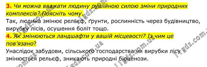 3. Чи можна вважати людину рушійною силою зміни природних комплексів? Поясніть чому. Так, людина змінює рельєф, ґрунти, рослинність через будівництво, вирубку лісів, осушення боліт тощо. 4. Як змінюються ландшафти у вашій місцевості? Із чим це пов’язано? Унаслідок забудови, сільського господарства чи вирубки лісу змінюється рельєф, зникають природні біоценози.