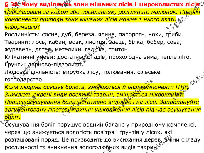 § 38. Чому виділяють зони мішаних лісів і широколистих лісів Перейшовши за кодом або посиланням, розгляньте малюнок. Про які компоненти природи зони мішаних лісів можна з нього взяти інформацію? Рослинність: сосна, дуб, береза, ялина, папороть, мохи, гриби. Тварини: лось, кабан, вовк, лисиця, заєць, білка, бобер, сова, журавель, дятел, метелики, гадюка, тритон. Кліматичні умови: достатньо опадів, прохолодна зима, тепле літо. Ґрунти: дерново-підзолисті. Людська діяльність: вирубка лісу, полювання, сільське господарство. Коли людина осушує болота, змінюються й інші компоненти ПТК. Зникають окремі види рослин і тварин, змінюється мікроклімат. Процес осушування боліт негативно впливає і на ліси. Запропонуйте аргументовану гіпотезу причин ушкодження лісів під час осушування боліт. Осушування боліт порушує водний баланс у природному комплексі, через що знижується вологість повітря і ґрунтів у лісах, які розташовані поряд. Це призводить до висихання дерев, зміни складу рослинності та зникнення вологолюбних видів тварин.