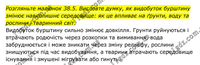 Розгляньте малюнок 38.5. Висловте думку, як видобуток бурштину змінює навколишнє середовище: як це впливає на ґрунти, воду та рослини і тваринний світ. Видобуток бурштину сильно змінює довкілля. Грунти руйнуються і втрачають родючість через розкопки та вимивання, вода забруднюється і може зникати через зміну рельєфу, рослини знищуються під час видобування, а тварини втрачають середовище існування і змушені мігрувати або гинуть.